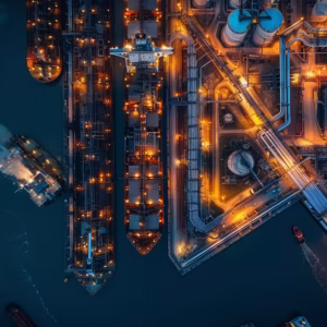 Our maritime logistics in motion — cargo ships, fuel barges, and offshore coordination with global partners.